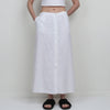 White linen maxi skirt with full button-down front. angled side pockets. unlined.